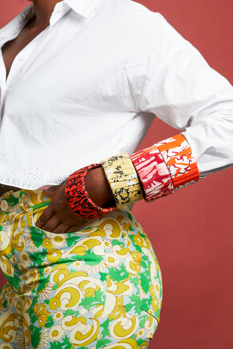 Add colour and culture to your look with this vibrant set of four bangles. Handmade from lightweight wood and authentic African wax prints. Each piece celebrates traditional craftsmanship while offering a fresh, modern style.