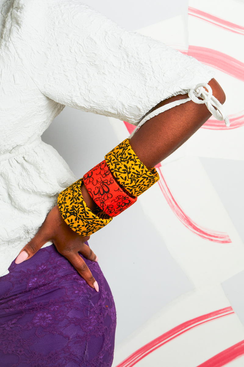 Add colour and culture to your look with this vibrant set of four bangles. Handmade from lightweight wood and authentic African wax prints. Each piece celebrates traditional craftsmanship while offering a fresh, modern style.