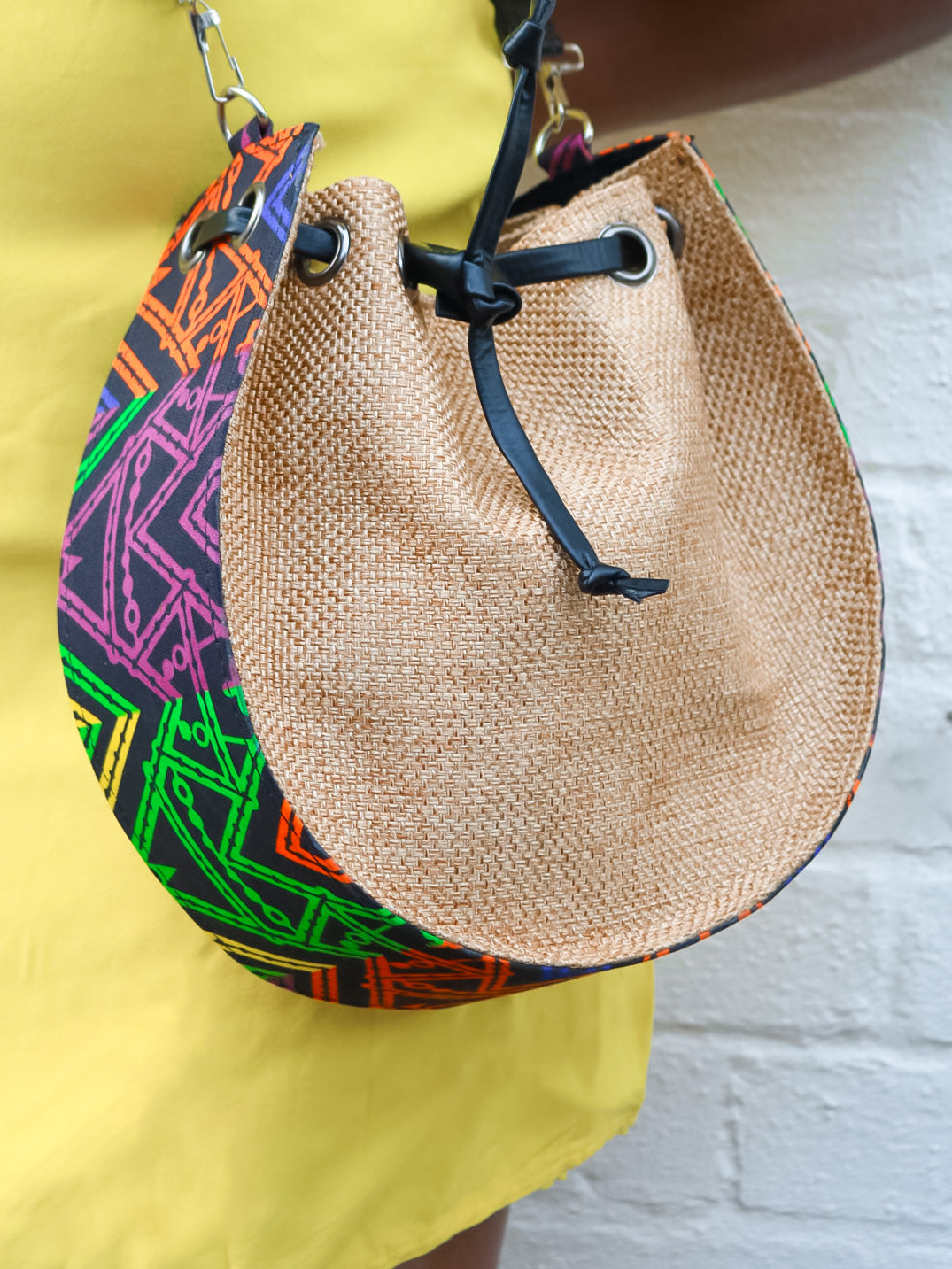 Made from jute, and Wax print detailed outer, this bag is perfect for everyday errands.