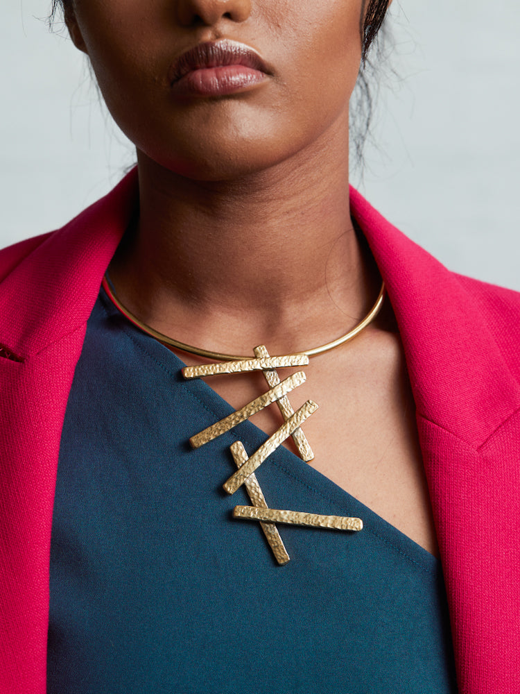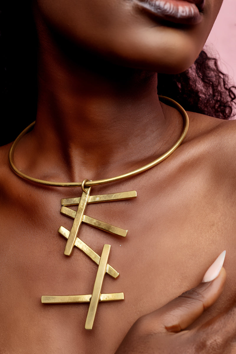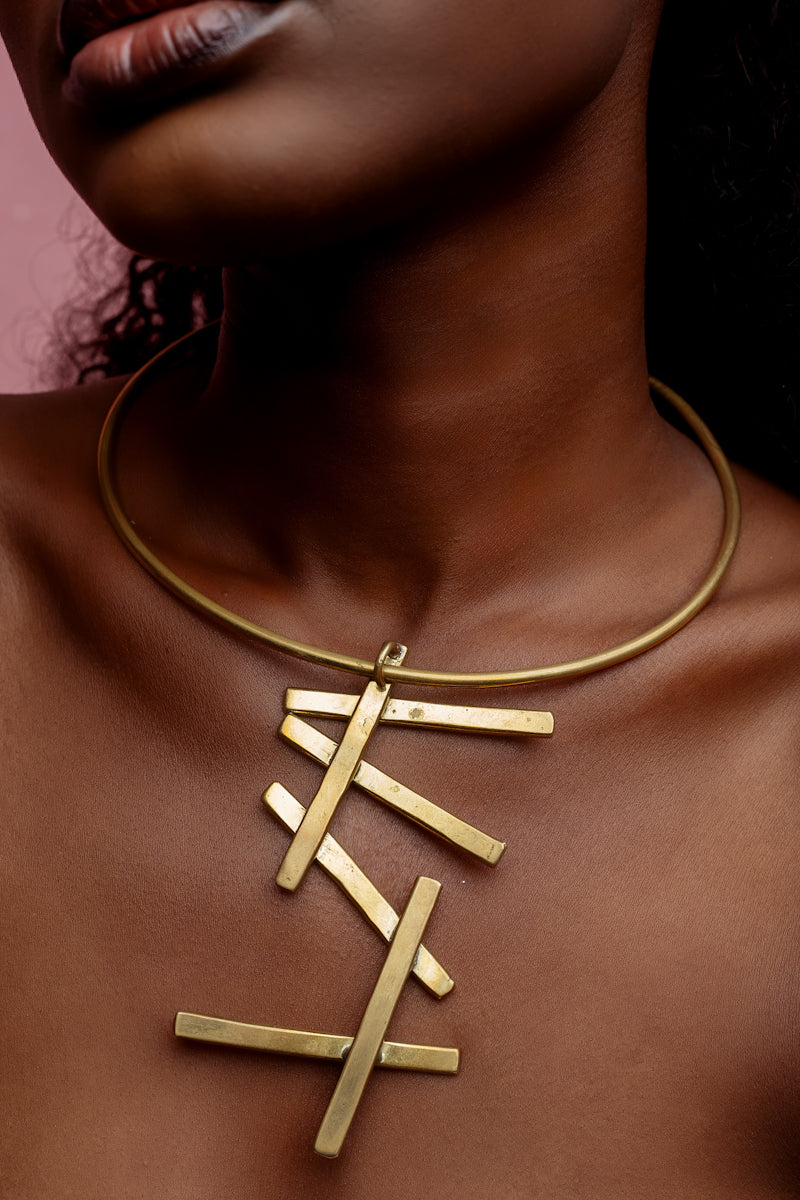 NAIRO CHOKER- MSTARI derives its name from the Swahili word "line". This statement piece features handcrafted geometric lines using East African 100% recycled brass and melted glass.