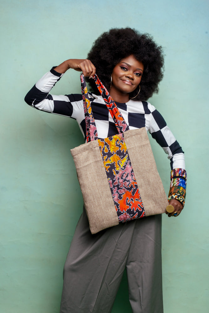Using Jute material, plus respective traditional cotton Ankara, also called wax print, this tote bag can be worn on either side. Giving you the option of maximum option.